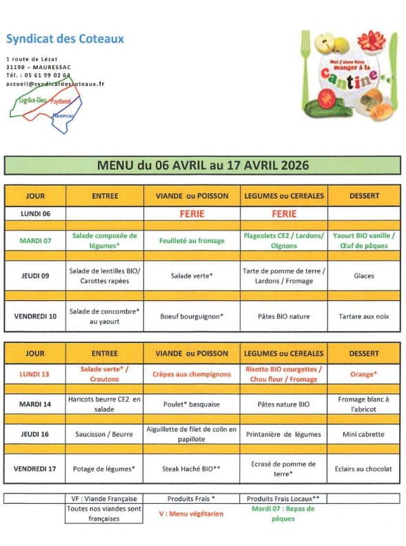 Menus du 06 avril au 17 avril 2026 :